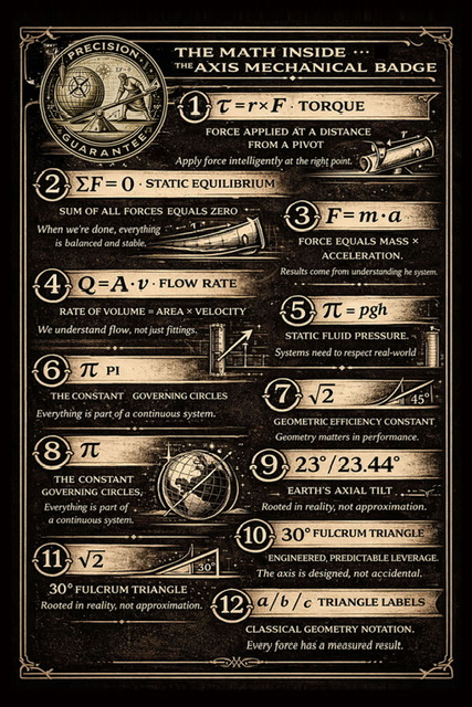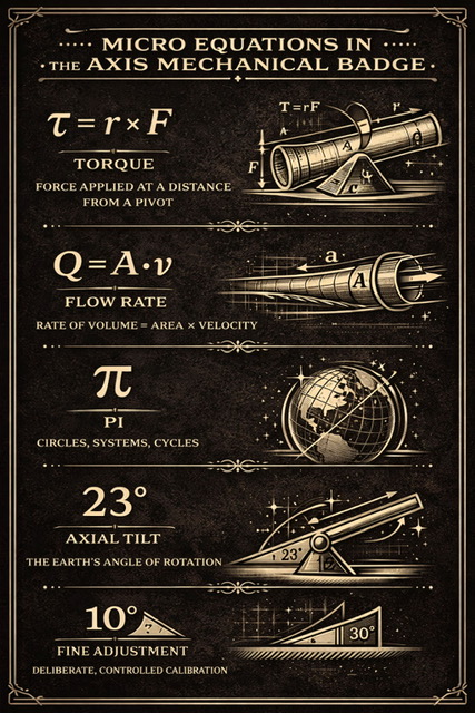 That idea is built into the Axis Mechanical badge. A subtle reference to Descartes’ Cartesian coordinates reflects how systems are measured and understood through structure, orientation, and clear reference points (like XYZ grid). At the same time, the nod to Earth’s 23-degree axial tilt grounds the design in reality, recognizing that even natural systems rely on precise geometry to function correctly.